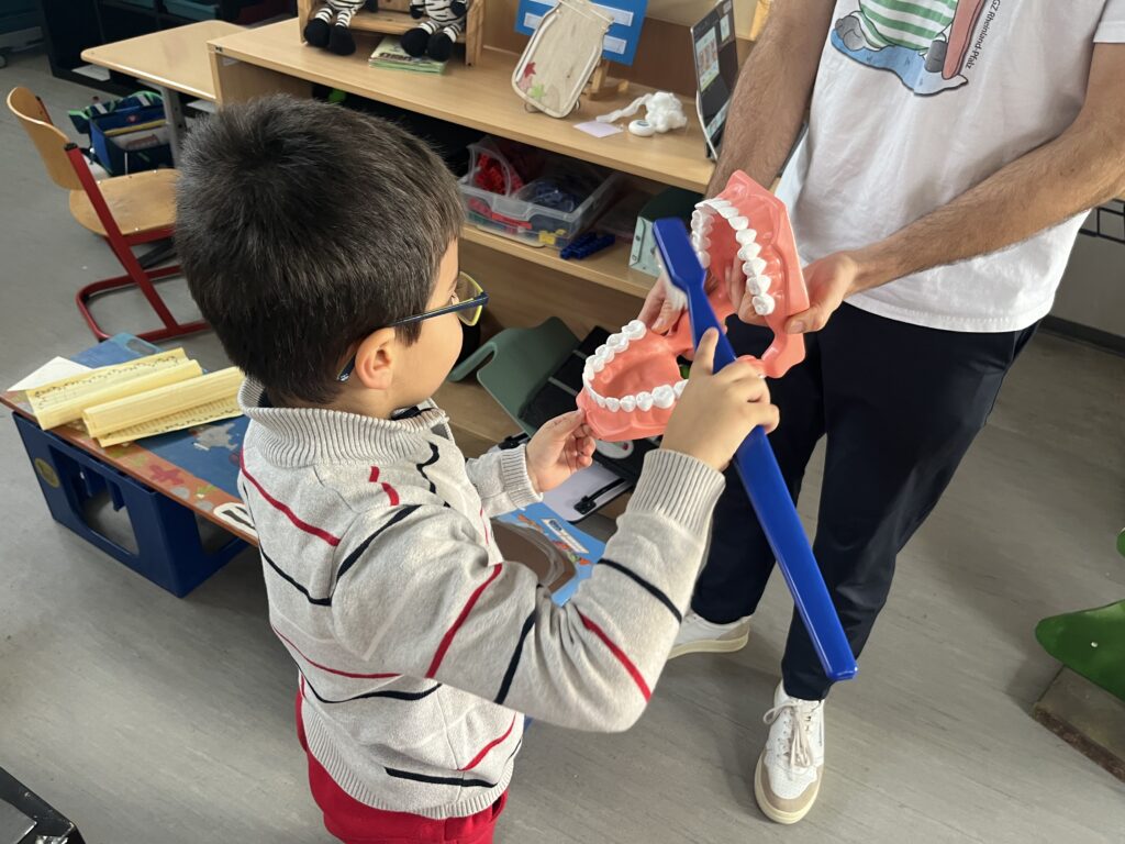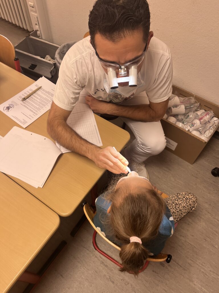 Der Zahnarzt Dr. Kalkan hat die Kinder der ersten Klassen am Anfang der Woche besucht und gemeinsam mit ihnen eine kindgerechte zahnärztliche Untersuchung durchgeführt. Die Schülerinnen und Schüler konnten dabei nicht nur ihre Zähne überprüfen lassen, sondern auch viele spannende Dinge über Zahngesundheit erfahren.
