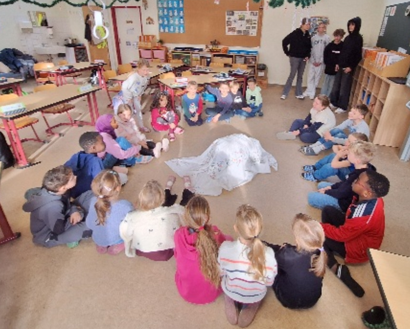 Am Mittwoch (03.12.2025) hatte die Klasse 2a Besuch von 4 SchülerInnen der 7. Klasse vom Nikolaus-von-Weis-Gymnasium in Speyer. Im Rahmen eines sozialen Projektes, wollten die vier Großen anderen eine Freude machen und hatten daher beschlossen, am Vormittag für 1,5 Stunden einige Spiele im Klassenverband anzubieten. Die GrundschülerInnen genossen das Angebot sehr und hatten viel Spaß beim Spielen von zum Beispiel “Menschenmemory“ oder “Nachts im Museum“.
