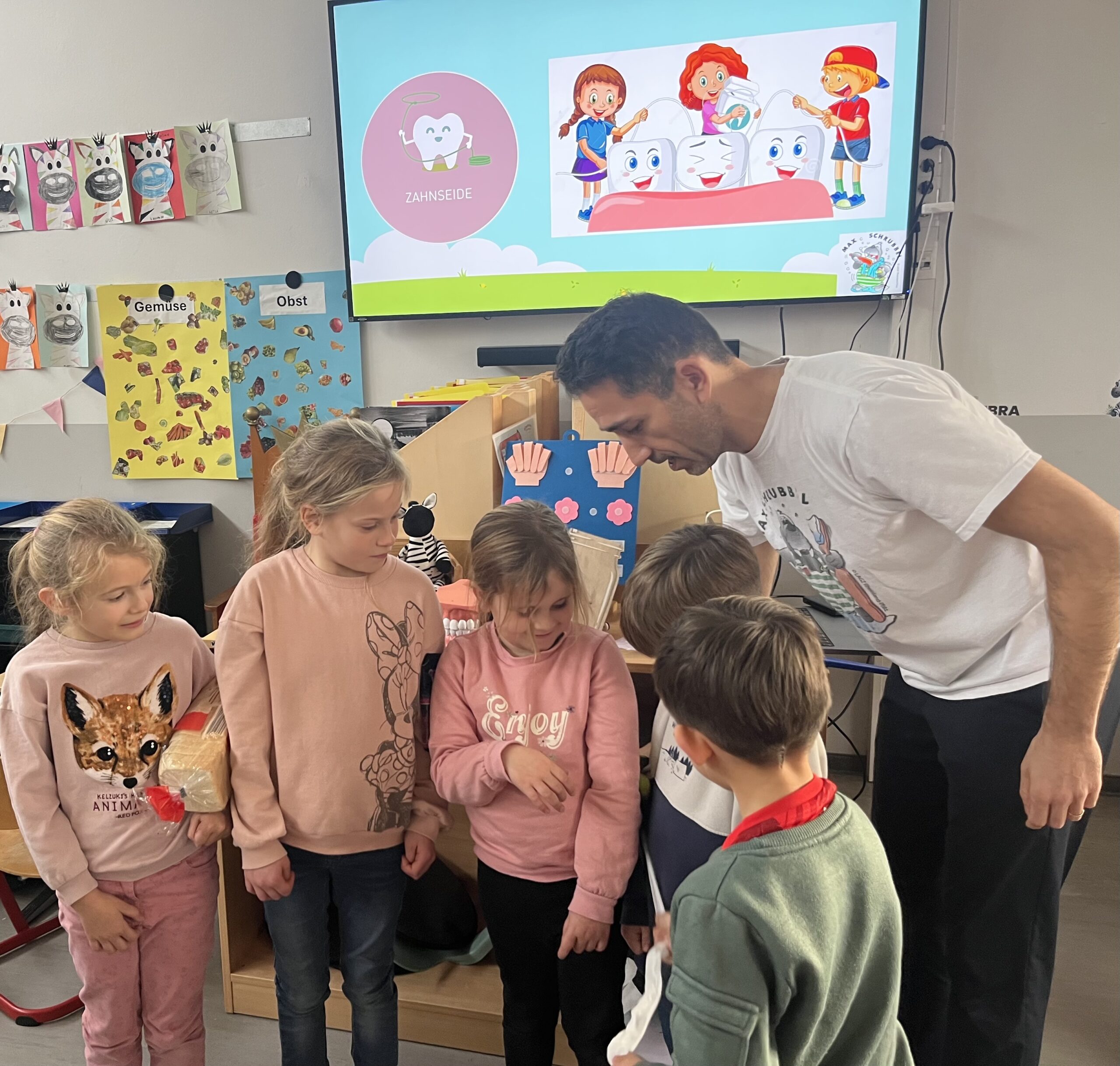 Heute durfte die Klasse 1A – ebenso wie alle weiteren ersten Klassen – einen besonderen Besuch begrüßen: Zahnarzt Dr. Kalkan führte gemeinsam mit den Kindern eine spannende Unterrichtsstunde rund um das Thema Zähne und Zahnpflege durch.